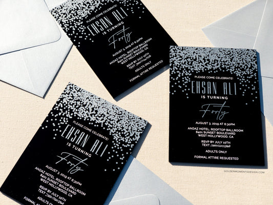 Confetti | Black Acrylic Invitation for Birthdays & Celebrations